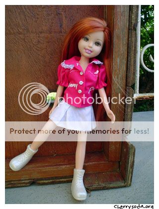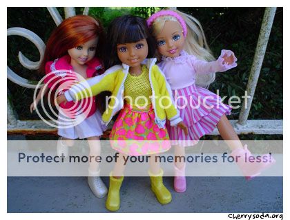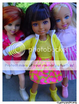 The red haired wears a Takara Jenny pink top and a Barbie white skirt. The blonde - A-zone pink blouse, Barbie pink and white skirt. The brunette, Takara Blythe yellow jacket, yellow net vest and flower skirt Barbie.
